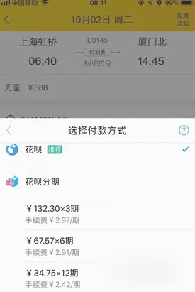 3、在列表中找到相乘坐的班次,点击进入详情页,选择购票,提交订单后来到确认付款的页面,点击付款方式,在选择付款的界面进行付款方式的修改,如图选择完成后点击右上角的勾号,然后付款就好了。