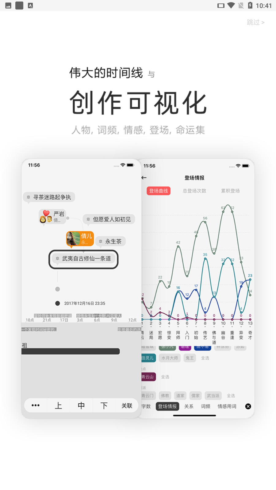 云上写作是一款辅助写手写小说的超实用型软件,简单明了的人物关系图谱,可以帮你理清小说中的人物关系,以及记录每个人物的出场次数,提醒你每一个角色的作用,它还能帮你记录你写的总字数,以及每一章的字数,并且还能离线写作,专业的创作界面,全方位辅助你完成作品,不管你是刚开始学习写作的新人作者,还是久经写坛的老手,都可以下载这样一款应用,轻松又高效的写出极具观赏性的作品。