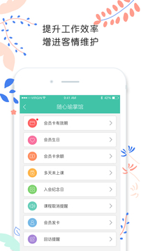 随心瑜掌馆——做个轻松的瑜伽人。随心瑜掌馆是随心瑜团队针对瑜伽馆及瑜伽从业者(瑜伽导师、瑜伽教练、瑜伽馆销售等工作人员)研发的一款APP。与随心瑜云平台实现“Web+App”无缝衔接,旨在提升瑜伽从业者的工作效率,帮助瑜伽馆提升经营管理能力。为瑜伽馆提升美誉度的同时也为瑜伽教练树立了个人品牌,将更好的将瑜伽运动、瑜伽的健康生活理念传播给世界。