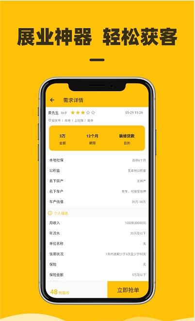 在软件中可以快速获取相应的成本内容进行体验,整合众多不同的客户资源在里面查看,海量的订单内容在软件中不断的体验和感受,解决经理的客户问题,大量的信贷客户资源可以在里面去发展。