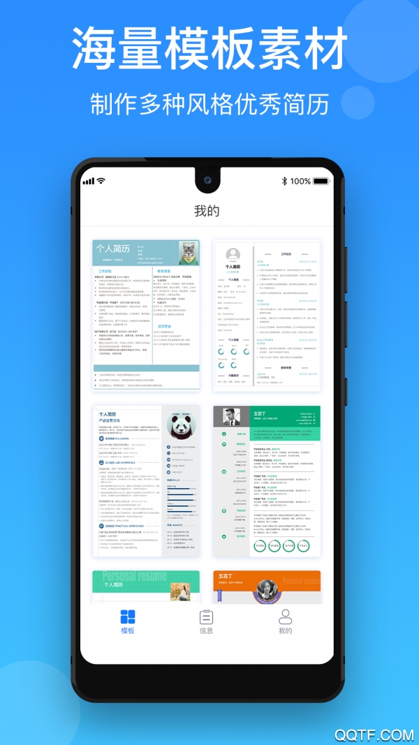 简历制作宝app超多款简历模板一键切换像美图秀秀切换滤镜一样简单,自动生成的完美简历排版。