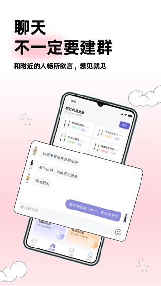 基于当前你的位置,为你展示附近0.2km-3km的活动室,创建自己爱好相关的群组,寻找一批和自己志同道合的人,一起玩耍。