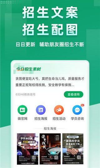 3、招生:每天更新招生文案配图,体系自动分配学员,招生不费力。