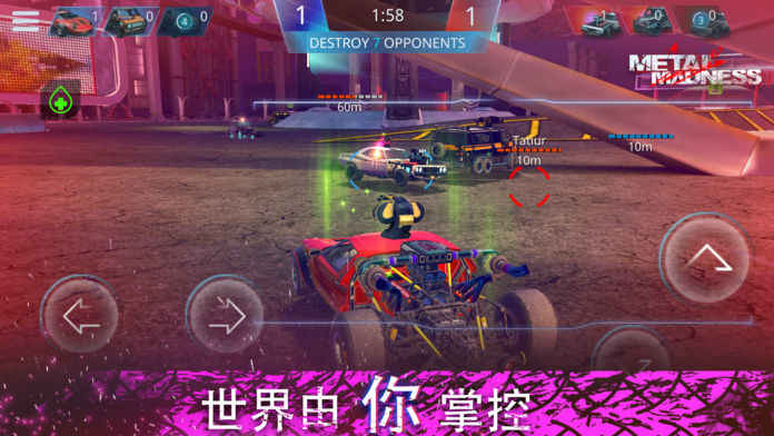 驾驶赛车,发射武器,将阻碍自己拿到名次的对手一一击倒,但是你也会遭到其他对手的攻击,看看你能否在这里顺利取得比赛的冠军吧。Metal Madness是一款玩法独特的赛车竞速手游,实时多人游戏战斗,出众的画质,多样的武器,给你带来不一样的速度与激情,世界等你来掌握,喜欢的玩家快来下载吧!