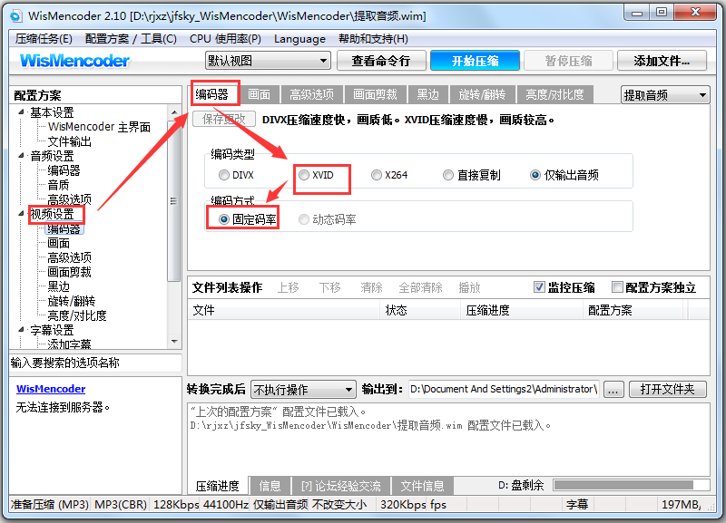 3. 视频设置——编码器:建议选择XVID,动态码率(或x264,固定码率);