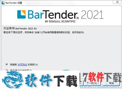 2、双击“BarTender_2021_R1_Full_x64.exe”文件运行,勾选协议及软件安装设置