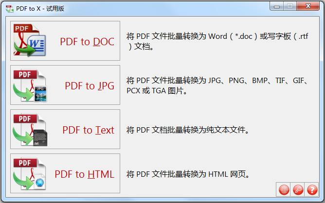本站为用户带来的PDF to X中文破解版是一款 PDF 文档转换软件,能够将 PDF 文档转换为 Word 文档、HTML 页面、富文本、多种图片格式,支持批量转换。系统里即使没有安装 Adobe Acrobat 或者 Adobe Reader 都能执行转换功能。软件尽可能地保留了各种输出文件中 PDF 文档的原始文本,图像,格式和布局。此外,PDF to X 支持转换密码保护的 PDF 文件,并指定页面范围转换(DOC,RTF,JPG,GIF,PNG,BMP,TIF,PCX,TGA 文件),并支持转换 PDF 文件限制,如内容复制,保存为文本,页面提取,打印不允许(对于 HTM L和 TXT 文件)。