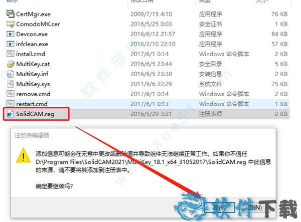 16、打开这个文件夹,双击“SolidCAM.reg”文件,点击“是”添加注册表。