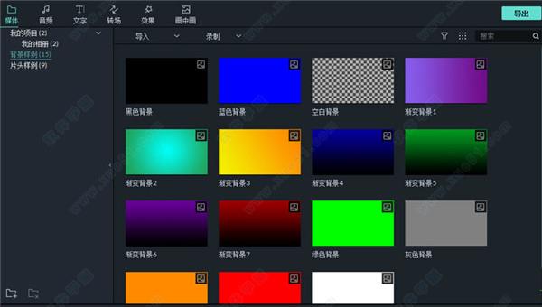 万兴喵影包括几种背景样例和倒计时片头样例视频。 要获取这些资源,单击“媒体”并选择“背景样例”或“片头样例”。