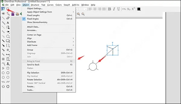 接下来只需将两组化学键合并即可完成图像的绘制,首先需要点击套索工具,然后选择右上角的图形,点击Object菜单中的Bring to front选项,拖动图像至左下角图像中央就可将其置于其前方,即完成了该Newman结构式的绘制。