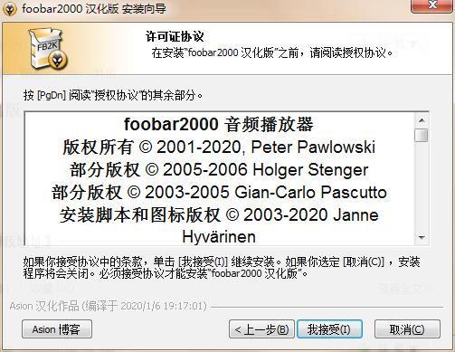 1、下载软件后,双击“FB_1、5、1_Asion_20200106191702、exe”开始安装Foobar2000 中文版,点击下一步